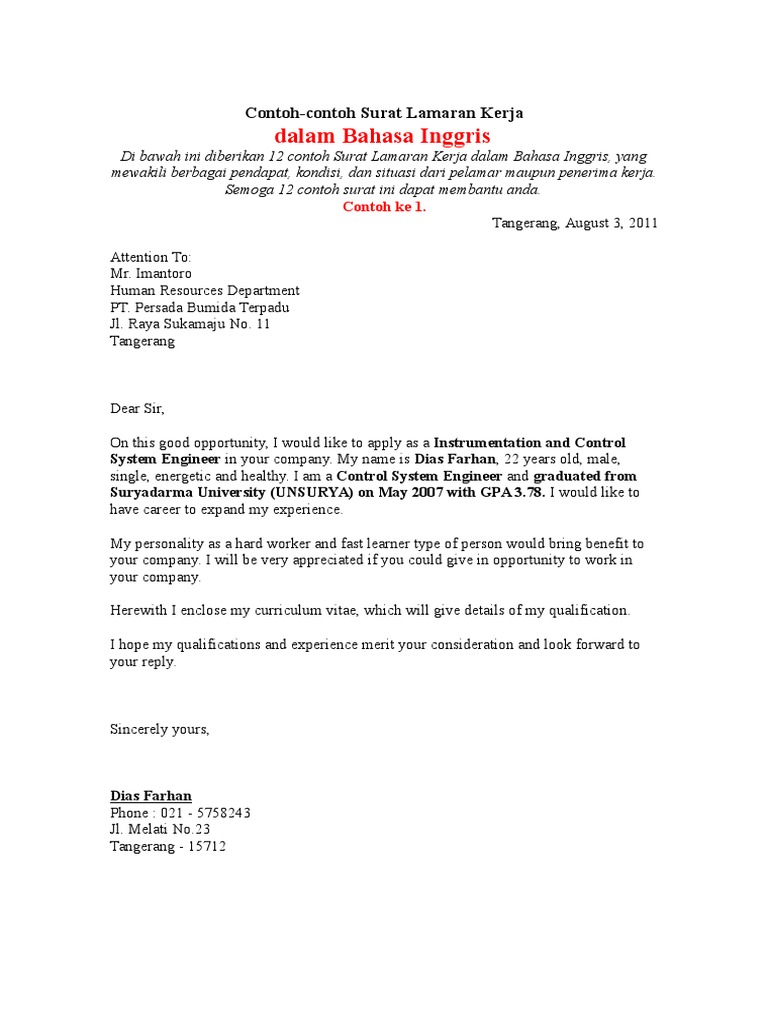 Jika anda sudah memiliki pengalaman kerja, anda dapat menggunakan contoh surat lamaran kerja dibawah ini sebagai inspirasi. Contoh surat lamaran kerja berpengalaman. Apr 05, 2021 · gunakan tata bahasa yang baik dan benar, baik itu dalam bahasa indonesia maupun bahasa inggris. Surat adalah sarana komunikasi untuk menyampaikan informasi tertulis oleh suatu pihak kepada pihak lain dengan tujuan memberitahukan maksud pesan dari si pengirim. Oleh karena itu, terdapat beberapa perusahaan yang membuat persyaratan untuk calon pekerjanya yang harus mengirim surat lamaran dan cv dalam bahasa inggris.